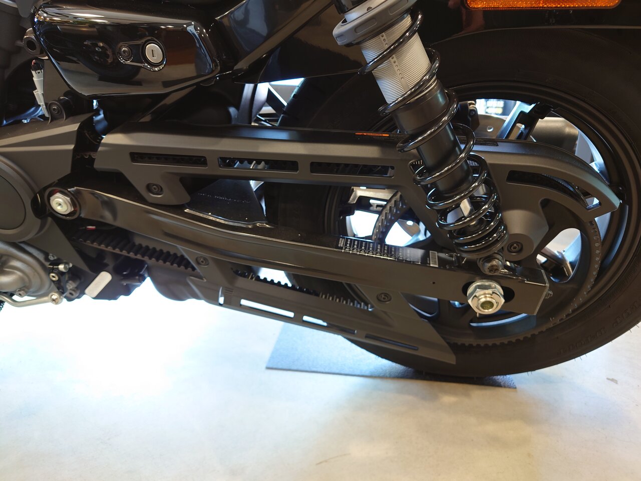 (スポーツスターSのスペシャルなリア周り。こんなスイングアームをハーレーが採用するとは。この無駄にコストかけたナンバーステーもこれ見ながらご飯3杯いける。)