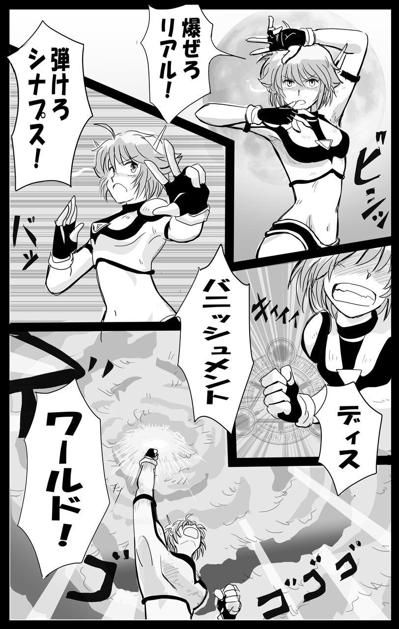 「人造の魔神と鬼神たちの間に生まれし俺は、太陽の灼熱の業火に焼かれながら、一杯の暗黒の聖水を求め、魔導アーマー「鷹十一式」と共に走り出した。次元管理局からの万物を破断せしめる召喚音波を受信し、魔道端末が先程から慟哭を続けている。しかし、四大天使と七十二の使徒を使役し、絶対の結界防御術式を展開できる俺にはまったく効果を及ぼさない。俺は鋼の教えと闇を司る魔が支配する管理局の魔の手から、ついに解き放たれた。この心の解放を伝える秘術を残念ながら俺は持ち合わせていないが、俺にはこの世界の理がすでにわかっている。そう、俺は間違ってはいない。間違っているのは・・・世界だ!!」