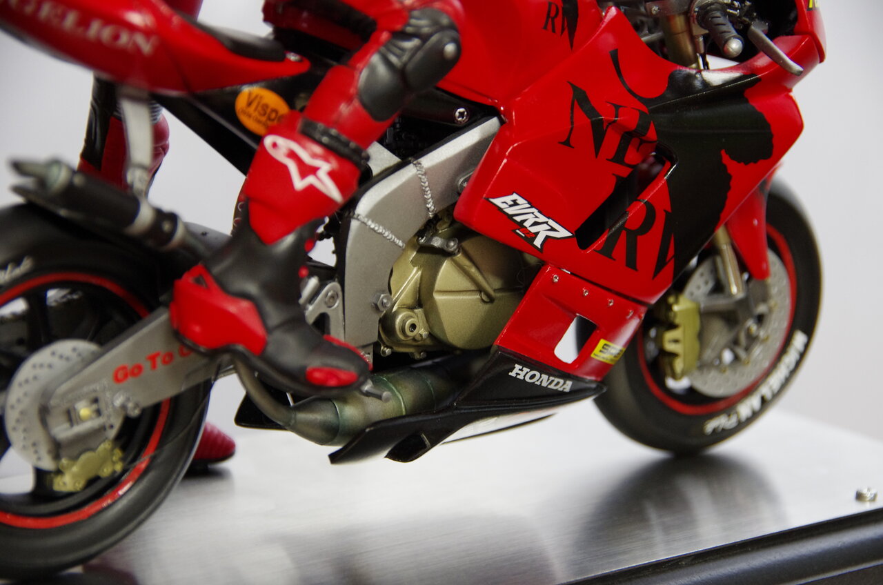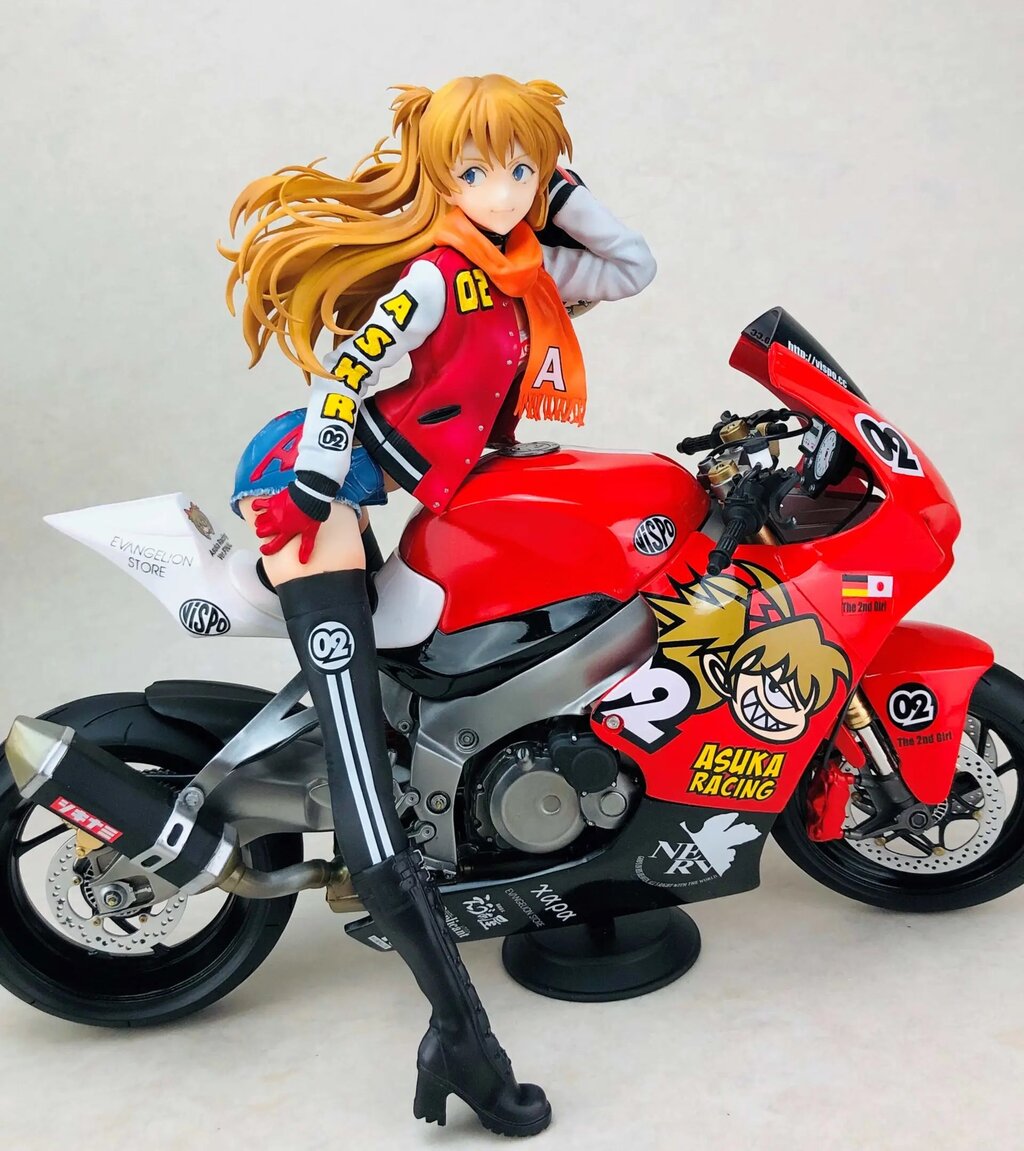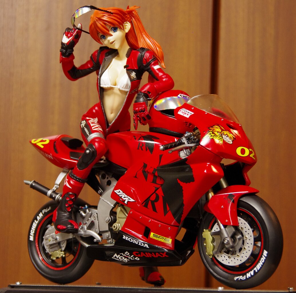 (Vispoさん最初期の作品、アスカR。女子とバイクの組み合わせキットの先駆けであり、私的にはガレキフィギュア史上最高傑作かつ最高難度モデルの一つ。製作するのに途方もない時間を要した記憶があります。しかし完成すればその苦労も全て吹っ飛ぶ造形美がある。)(このキットの真のヤバさはレジンバイクのNSR50。まさに地獄。ヘタすると帆船模型と同レベルかも。特に初期のアスカRの地獄っぷりは群を抜いてて、歪み補正、組み立て、デカール貼りと、作業内容の難度が究極。歪みが酷くて普通に組むと絶対に組み上がらないし、重量も凄いんで接着剤が効かないレジンでなんとか組み立て強度を確保しなきゃならない。カウルの複雑な曲線に貼り込むネルフデカールのヤバさも尋常じゃない。これは造形師のモデラーに対する挑戦状です。)