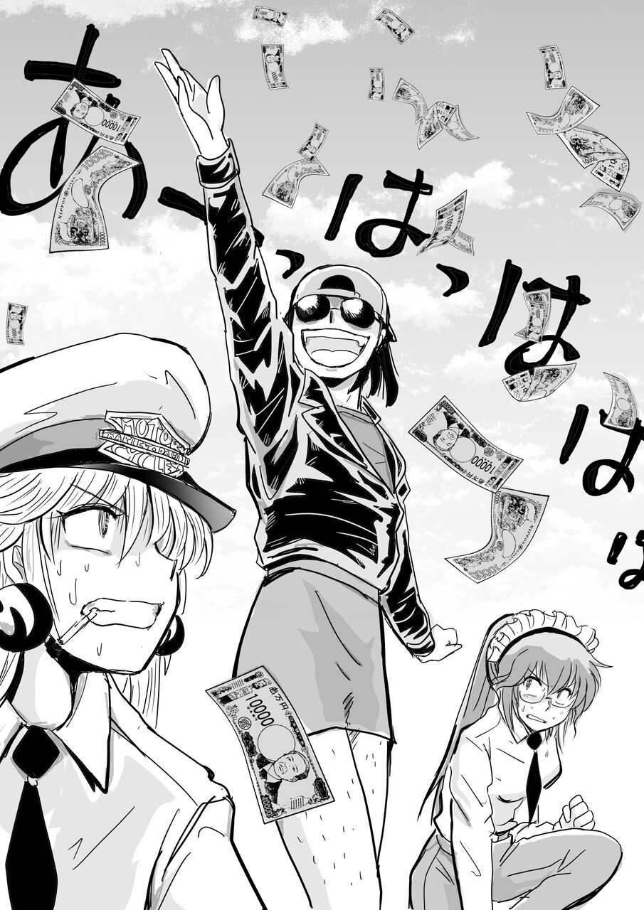 (笑顔で手にもった1万円札を撒きまくる。それを必死に拾い集めるダイナ嬢ときんつば嬢)