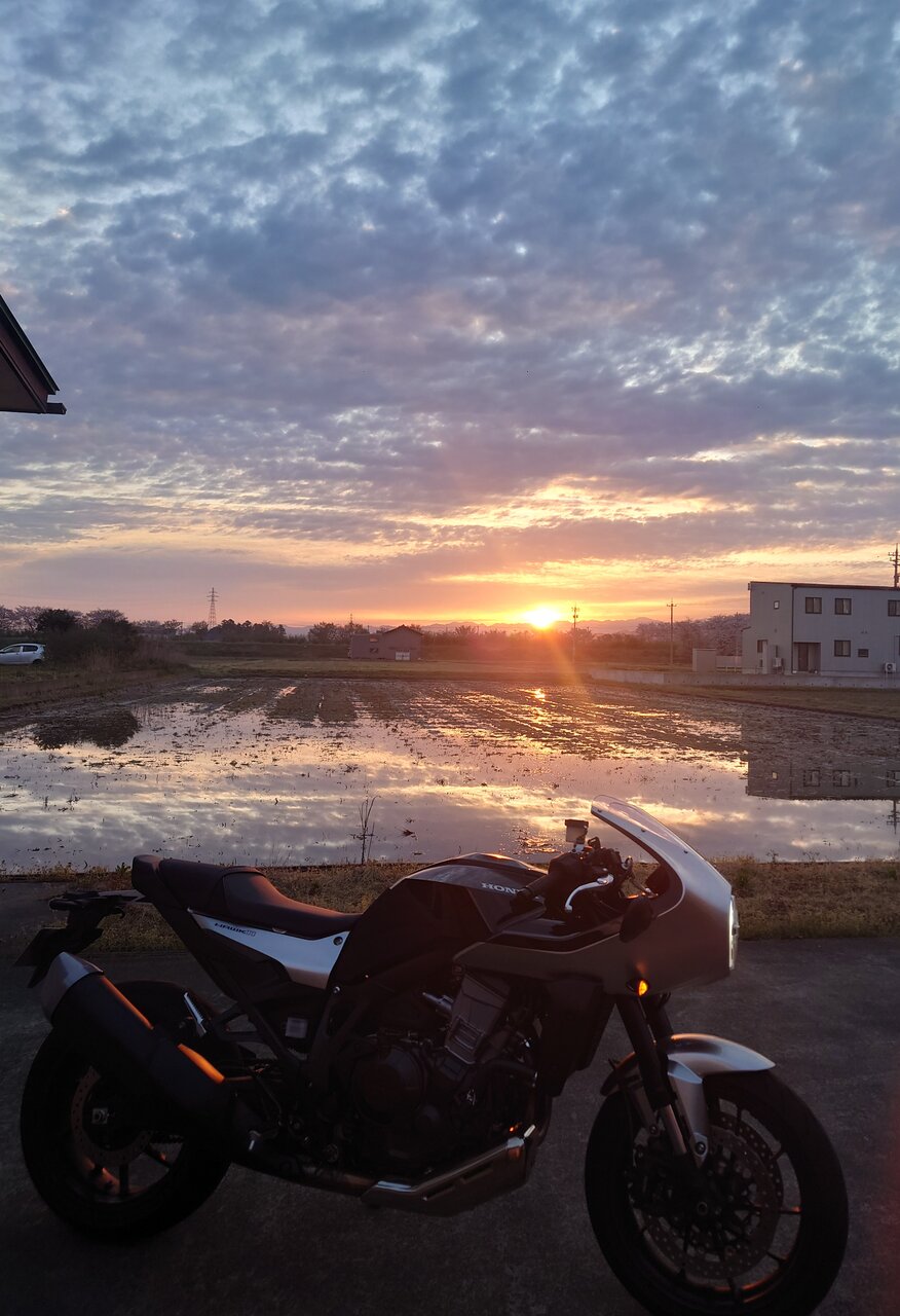 (日の出を横目にガレージから出撃。朝焼けのオレンジが美しすぎてメトロン星人を召喚したくなる。)