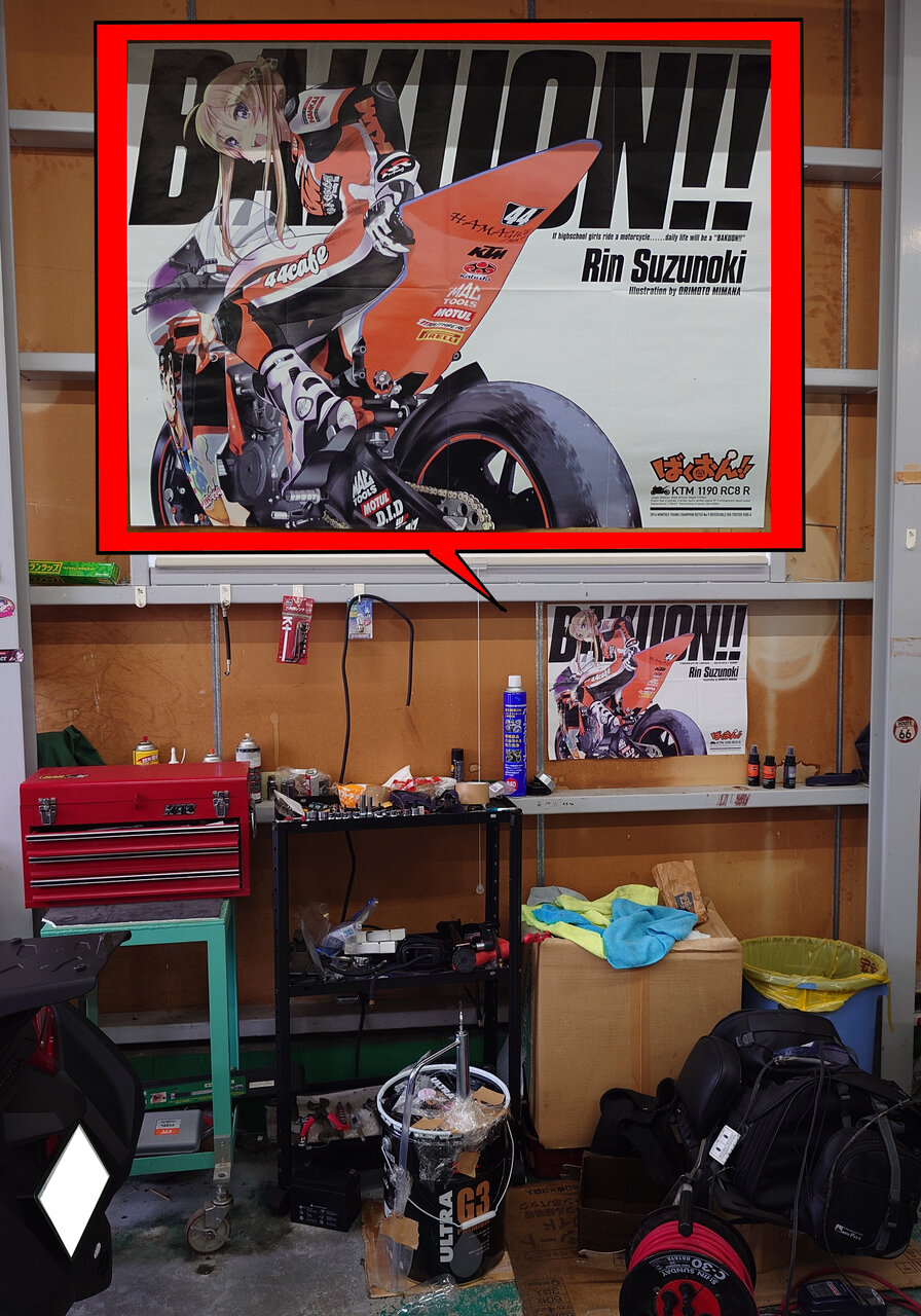 「そして工具入れ付近の壁には「ばくおん」のポスターだ!KTMの鈴鹿8耐仕様1190RC8Rとのコラボであります!スズキ命の鈴乃木凜(すずのきりん)がなんでKTMなんだ!という根本的な疑問はさておき、「レーサーのリアビューと女子キャラのケツの両方で萌えてくれ!」という非常にあざといケツ萌えの構図。ブログ主はこの秀逸なポスターが付録となった月刊ヤングチャンピオンを書店で全数買い占めていますので、ポスターのストックは山ほどあるという病気っぷり!」