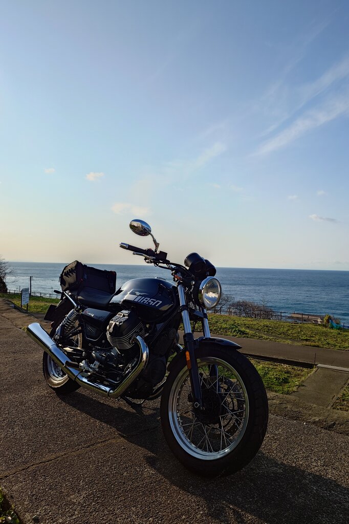 (モトグッチには、海沿いの高台がよく似合う。有名観光地や名勝ではなく、日常の何気ない風景がこのバイクにはピッタリ。)