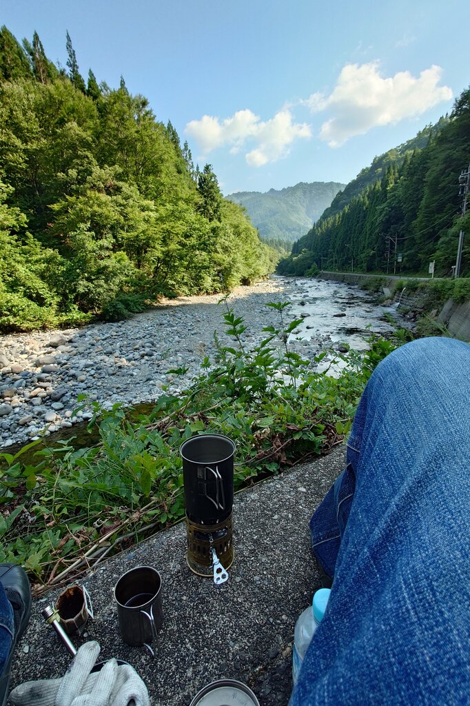 山方面はとにかく川辺がいいっすね。つーか、山は奥地に入ると割と無人で、どこでも店を開けるので迷うまである。交差するのに苦労するようなマイナー林道は車は敬遠してやってこないので、ギンギンに過疎ってます。そんな川沿いの道の道幅が広めのところにバイク止めて、川辺でコーヒー・グビ男になるのが、またオツなんですよぉ。