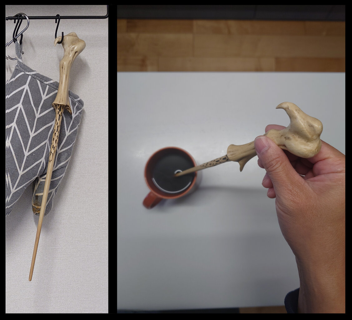 ちなみに朝、食物繊維の粉をコーヒーに混ぜるときに使っているのは、愚息がユニバーサルスタジオからお土産で買ってきた「ヴォルデモートの杖」です。魔法の才ある者を排出できなかった我が家系では、この杖を本来の用途に使うことはできず、私のコーヒーかき混ぜ用に使ってるんですけど、いや~実に怪しい高揚感がありますな。