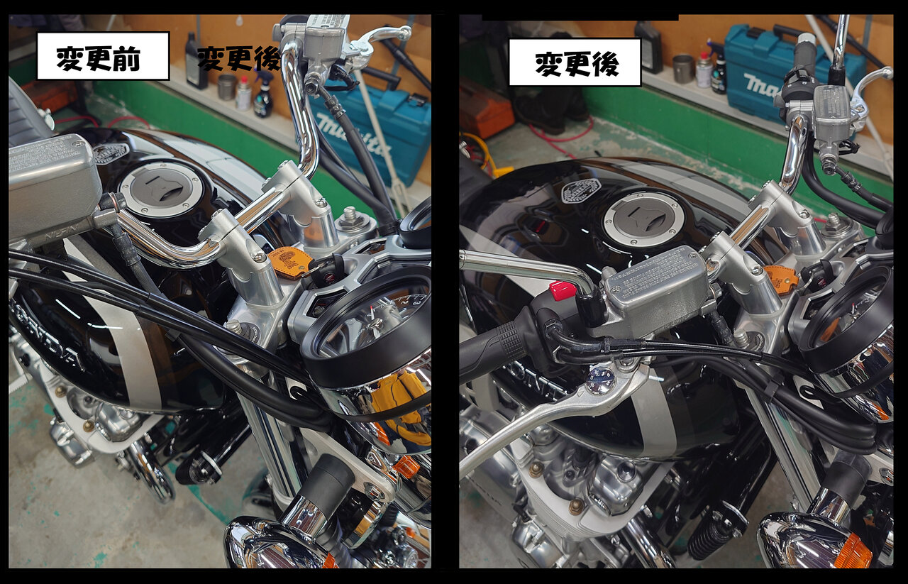 あと、これはちょっと意外だったんですけど、ハンドル替えたら、バイクの車庫入れ時の取り回しも、センスタ掛けも以前より重く感じなくなったんですよね。自分の体にフィットする位置にハンドルがくると、取り回しまで軽くなる。ハンドル位置ってのは、あらゆる意味で重要なんだな~って、改めて痛感した次第です。