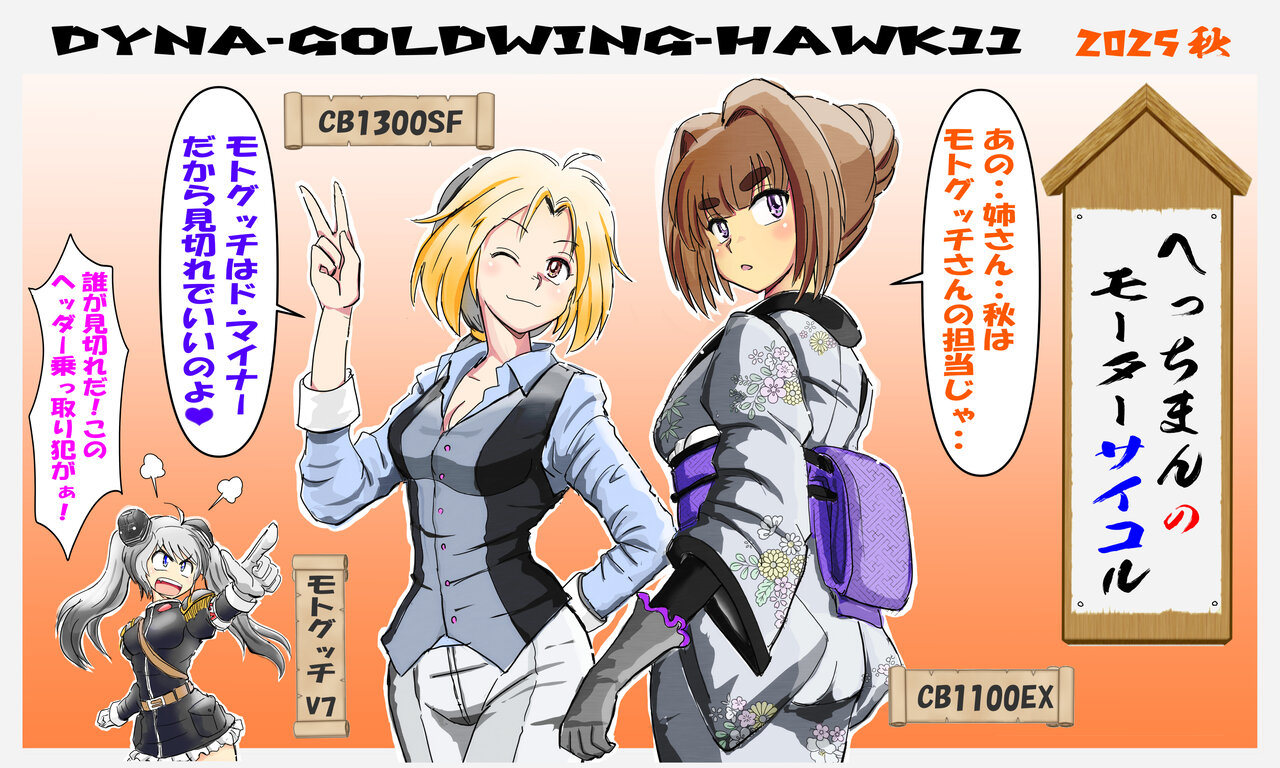皆さん、コンニチハ。低レベル絵師のへっちまんです。ヘッダーを秋のイラストに変更しましたので、今回は恒例の雑談回でダラダラと気楽にテキストを紡いでいきたいと思います。一見してわかると思いますが、ヘッダーモチーフはCB1300SFとCB1100EXのCB姉妹と、オマケのモトグッチV7です。