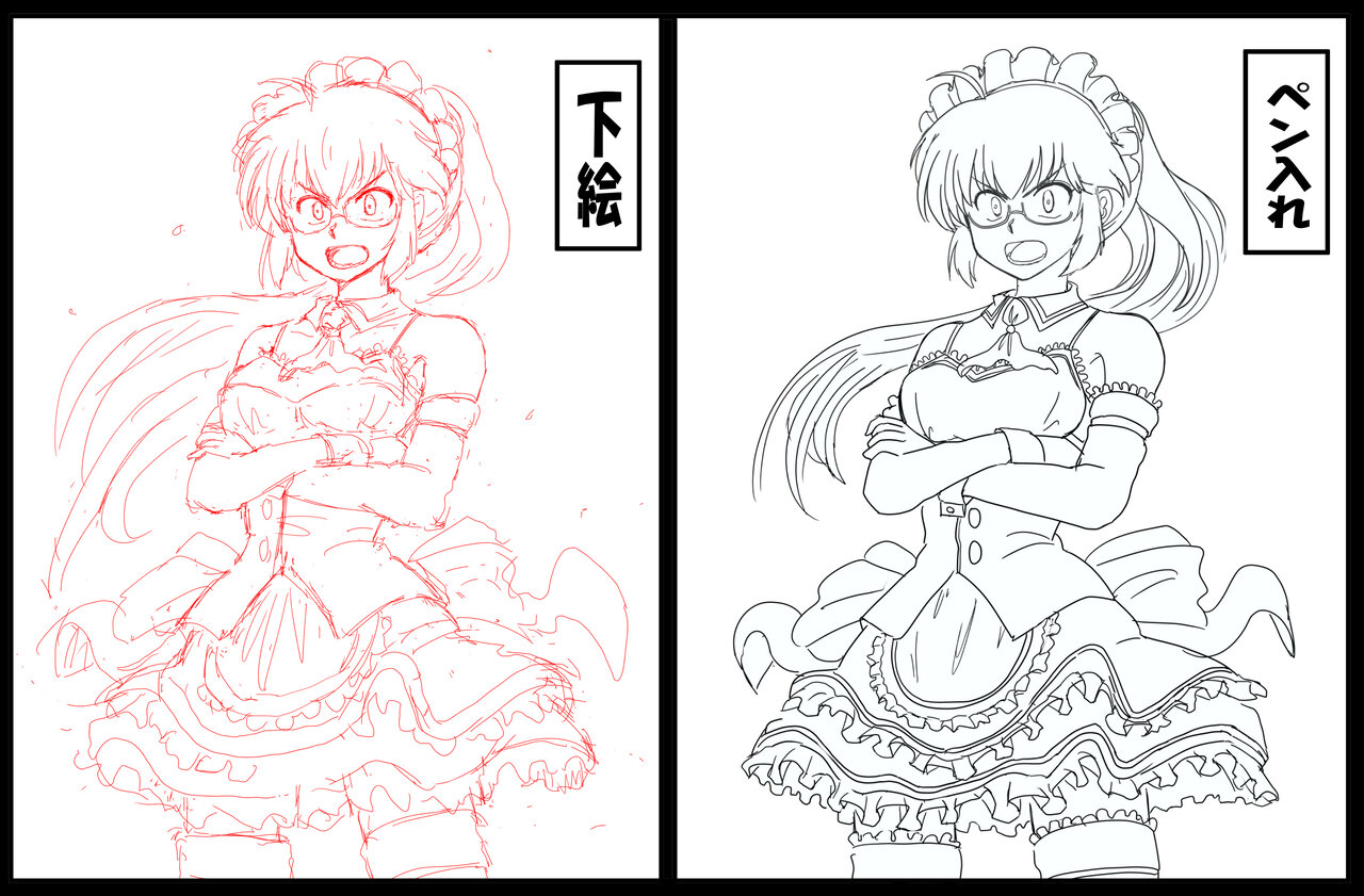 (今回のイラストはいつもどおりヘッダー製作過程です。まずは下絵をざっと描き、修正を入れつつペン入れしてカラーのベースを作ります。)