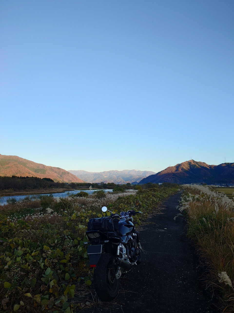 (素晴らしい景色に出会えそうだったので、川沿いの超細道に果敢に突撃。しかし、この土手上の小道はしばらく走ると行き止まりになり、この道幅でヒーコラUターンして戻ってくるハメに・・。CB1300SFのテキスト化は常にそんな状態でした。)
