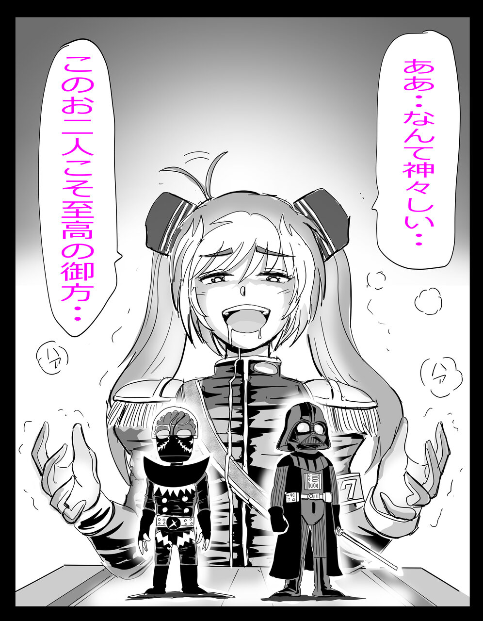 (こちらが「恋は混沌の隷也」。ベイダー卿+クトルフ神話+萌えアニメという宇宙的狂気の合成により、SAN値直葬をお届けする。なお「おジャ魔女カーニバル!!」あたりの選曲でも同レベルの恐怖効果が見込めるでしょう。)